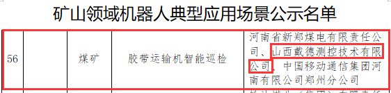 近日,国家矿山安全监察局与工业和信息化部联合公示了一份“矿山领域机器人典型应用场景名单”。在这份备受瞩目的名单中,戴德测控自主研发的矿用巡检机器人在“胶带运输机智能巡检场景类别”的应用中脱颖而出,成功入选。这一成果不仅展示了戴德测控在矿山安全领域的卓越实力,也彰显了科技创新在提升矿山安全生产水平中的重要作用。