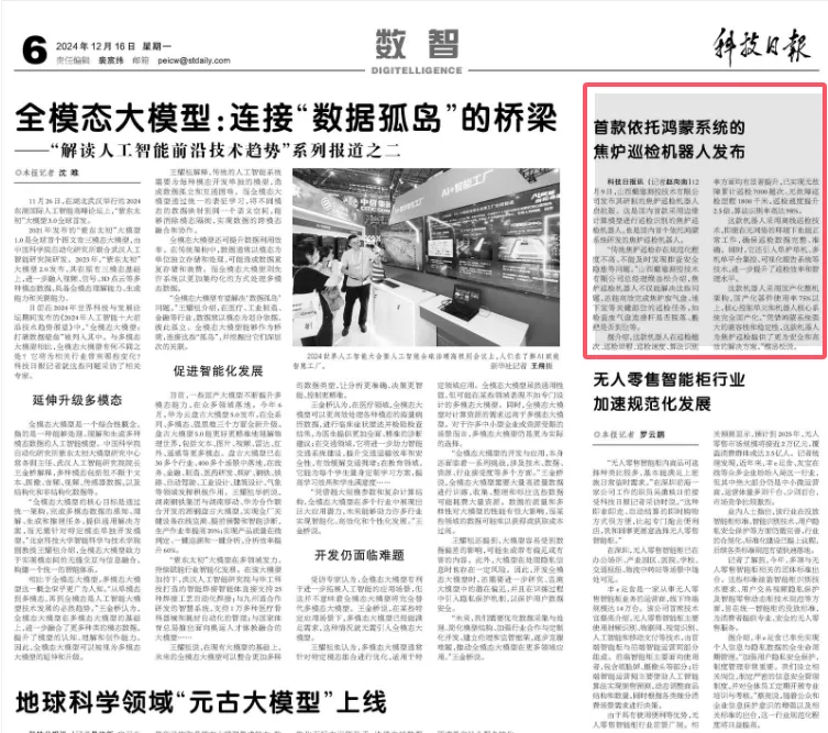 12月9日,山西戴德测控技术股份有限公司发布其研制的焦炉巡检机器人启航版。这是国内首款采用边缘计算模型进行巡检识别的焦炉巡检机器人,也是国内首个依托鸿蒙系统研发的焦炉巡检机器人。